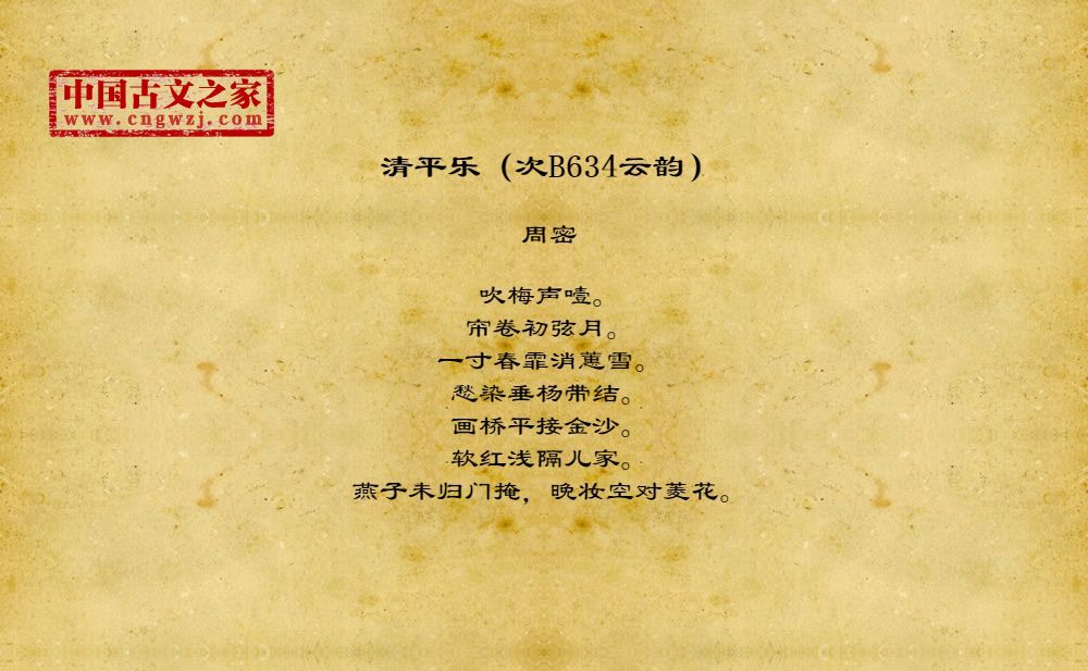 周密(1232-1298),字公谨,号草窗,又号四水潜夫、弁阳老人、华不注山人,南宋词人、文学家。祖籍济南,流寓吴兴(今浙江湖州)。宋德右间为义乌县(
