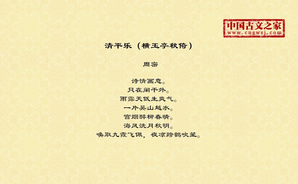 周密(1232-1298),字公谨,号草窗,又号四水潜夫、弁阳老人、华不注山人,南宋词人、文学家。祖籍济南,流寓吴兴(今浙江湖州)。宋德右间为义乌县(