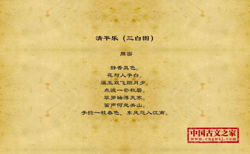 静香真色。花与人争白。属玉双飞烟月夕。点波一奁秋碧。翠罗袖薄天寒。笛声何处关山。手捻一枝春色,东风怨入江南。