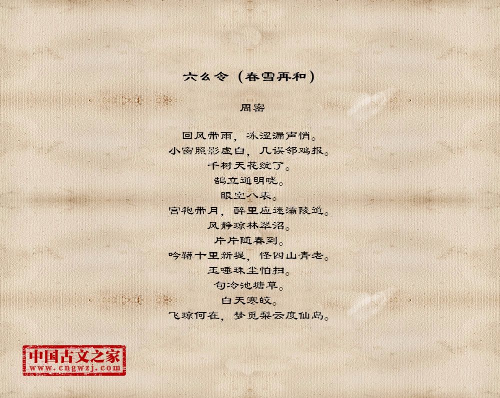 回风带雨,冻涩漏声悄。小窗照影虚白,几误邻鸡报。千树天花绽了。鹄立通明晓。眼空八表。宫袍带月,醉里应迷灞陵道。风静琼林翠沼。片片随春到。吟鞯十里新堤,怪四山青老。玉唾珠尘怕扫。句冷池塘草。白天寒皎。飞琼何在,梦觅梨云度仙岛。