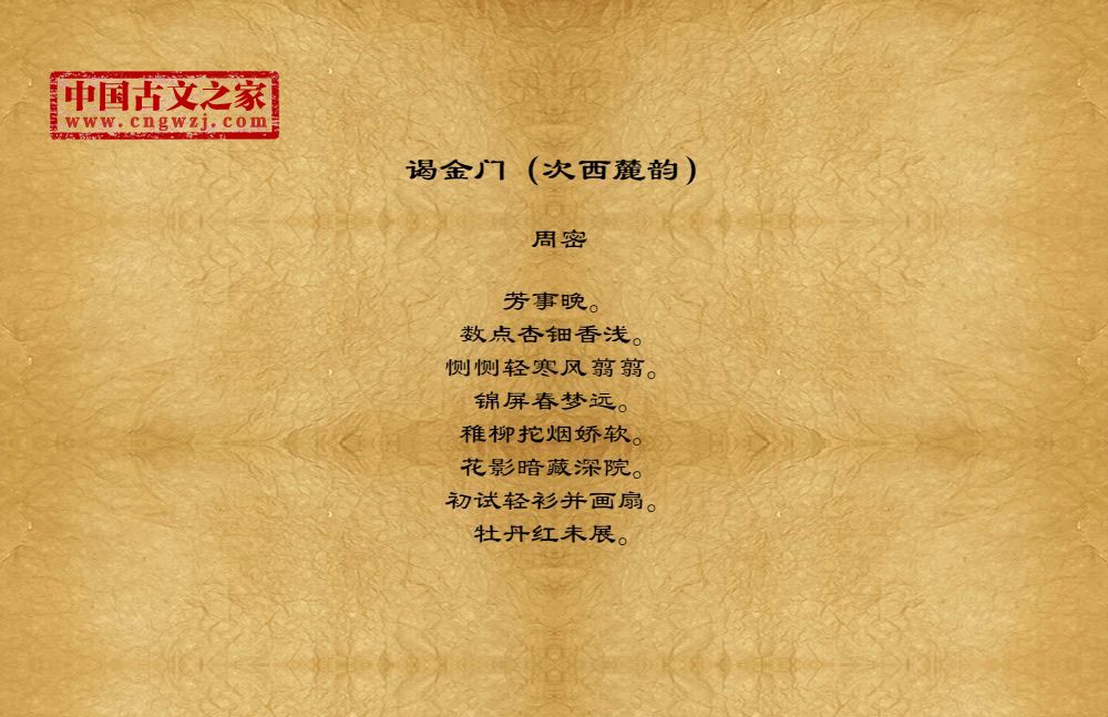 芳事晚。数点杏钿香浅。恻恻轻寒风翦翦。锦屏春梦远。稚柳拕烟娇软。花影暗藏深院。初试轻衫并画扇。牡丹红未展。