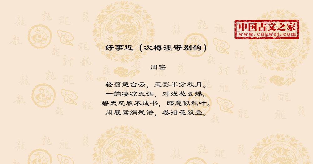 周密(1232-1298),字公谨,号草窗,又号四水潜夫、弁阳老人、华不注山人,南宋词人、文学家。祖籍济南,流寓吴兴(今浙江湖州)。宋德右间为义乌县(