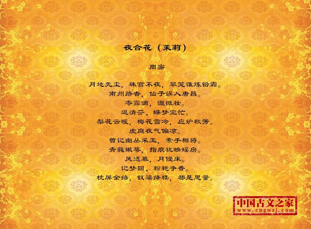 月地无尘,珠宫不夜,翠笼谁炼铅霜。南州路杳,仙子误入唐昌。零露滴,湿微妆。逗清芬、蝶梦空忙。梨花云暖,梅花雪冷,应妒秋芳。虚庭夜气偏凉。曾记幽丛采玉,素手相将。青蕤嫩萼,指痕犹映瑶房。风透幕,月侵床。记梦回、粉艳争香。枕屏金络,钗梁绛楼,都是思量。