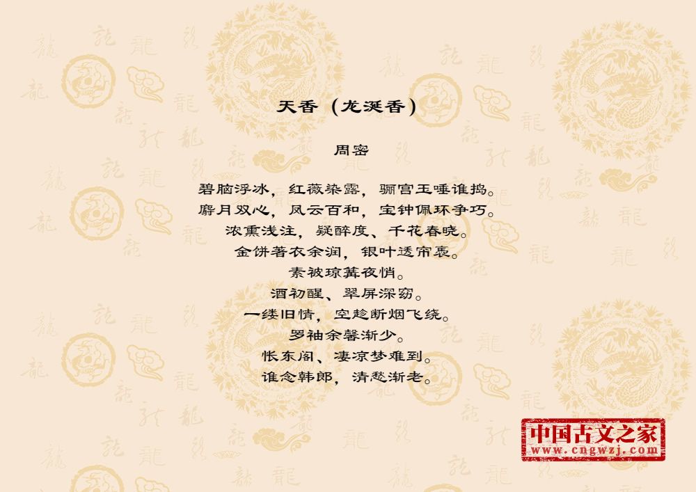 碧脑浮冰,红薇染露,骊宫玉唾谁捣。麝月双心,凤云百和,宝钟佩环争巧。浓熏浅注,疑醉度、千花春晓。金饼著衣余润,银叶透帘褭。素被琼篝夜悄。酒初醒、翠屏深窈。一缕旧情,空趁断烟飞绕。罗袖余馨渐少。怅东阁、凄凉梦难到。谁念韩郎,清愁渐老。