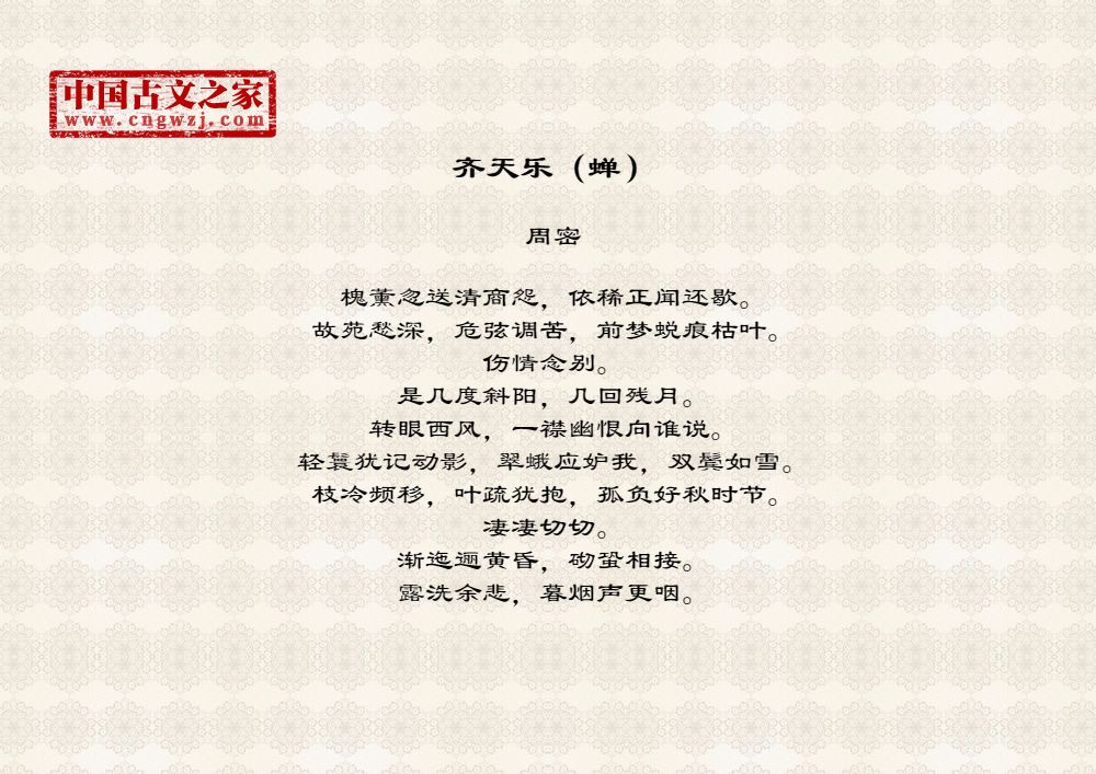 槐薰忽送清商怨,依稀正闻还歇。故苑愁深,危弦调苦,前梦蜕痕枯叶。伤情念别。是几度斜阳,几回残月。转眼西风,一襟幽恨向谁说。轻鬟犹记动影,翠蛾应妒我,双鬓如雪。枝冷频移,叶疏犹抱,孤负好秋时节。凄凄切切。渐迤逦黄昏,砌蛩相接。露洗余悲,暮烟声更咽。