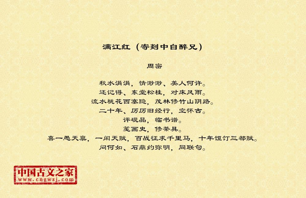 周密(1232-1298),字公谨,号草窗,又号四水潜夫、弁阳老人、华不注山人,南宋词人、文学家。祖籍济南,流寓吴兴(今浙江湖州)。宋德右间为义乌县(