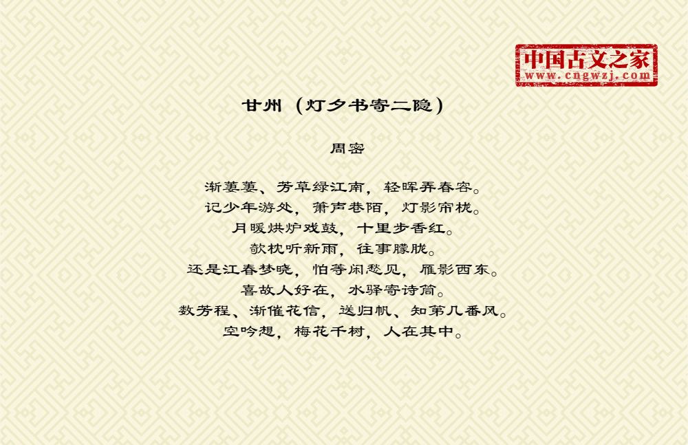 渐萋萋、芳草绿江南,轻晖弄春容。记少年游处,箫声巷陌,灯影帘栊。月暖烘炉戏鼓,十里步香红。欹枕听新雨,往事朦胧。还是江春梦晓,怕等闲愁见,雁影西东。喜故人好在,水驿寄诗筒。数芳程、渐催花信,送归帆、知第几番风。空吟想,梅花千树,人在其中。