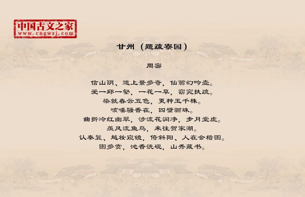 周密(1232-1298),字公谨,号草窗,又号四水潜夫、弁阳老人、华不注山人,南宋词人、文学家。祖籍济南,流寓吴兴(今浙江湖州)。宋德右间为义乌县(