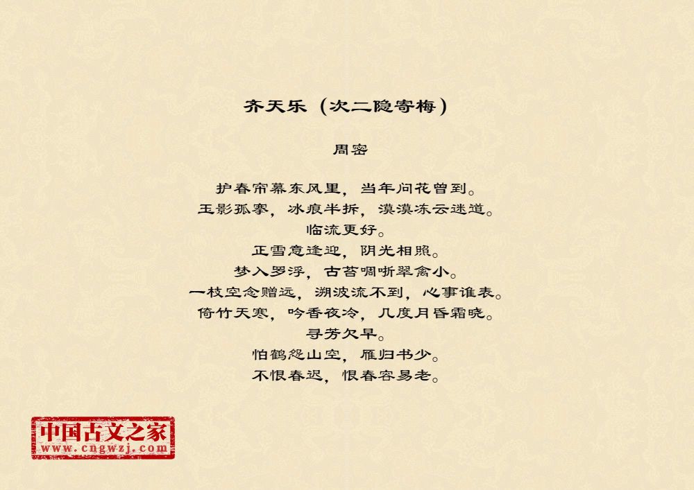 护春帘幕东风里,当年问花曾到。玉影孤搴,冰痕半拆,漠漠冻云迷道。临流更好。正雪意逢迎,阴光相照。梦入罗浮,古苔啁哳翠禽小。一枝空念赠远,溯波流不到,心事谁表。倚竹天寒,吟香夜冷,几度月昏霜晓。寻芳欠早。怕鹤怨山空,雁归书少。不恨春迟,恨春容易老。