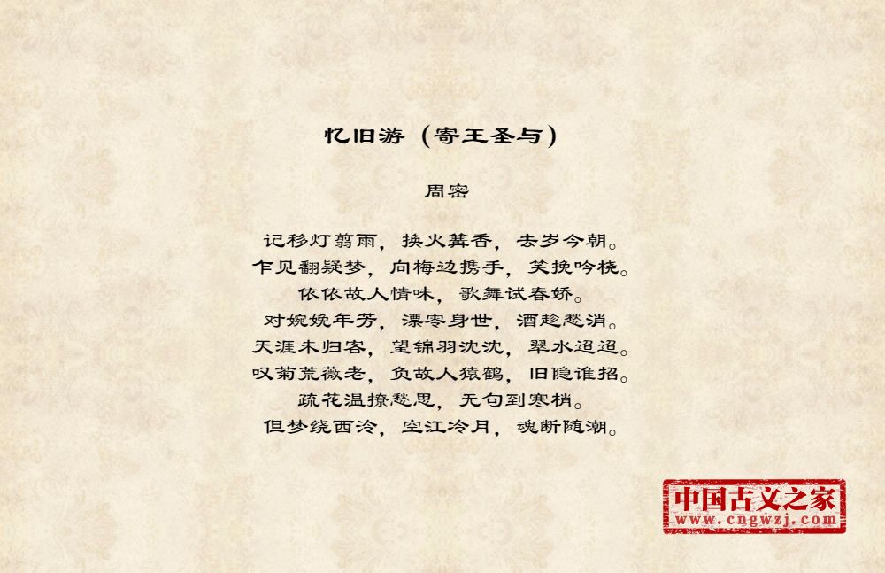 周密(1232-1298),字公谨,号草窗,又号四水潜夫、弁阳老人、华不注山人,南宋词人、文学家。祖籍济南,流寓吴兴(今浙江湖州)。宋德右间为义乌县(