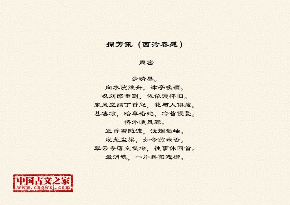 步晴昼。向水院维舟,津亭唤酒。叹刘郎重到,依依谩怀旧。东风空结丁香怨,花与人俱瘦。甚凄凉,暗草沿池,冷苔侵甃。桥外晚风骤。正香雪随波,浅烟迷岫。废苑尘梁,如今燕来否。翠云零落空堤冷,往事休回首。最消魂,一片斜阳恋柳。