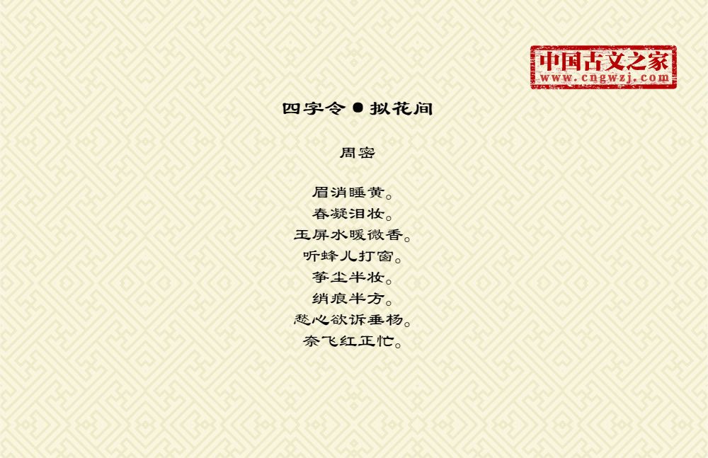 眉消睡黄。春凝泪妆。玉屏水暖微香。听蜂儿打窗。筝尘半妆。绡痕半方。愁心欲诉垂杨。奈飞红正忙。