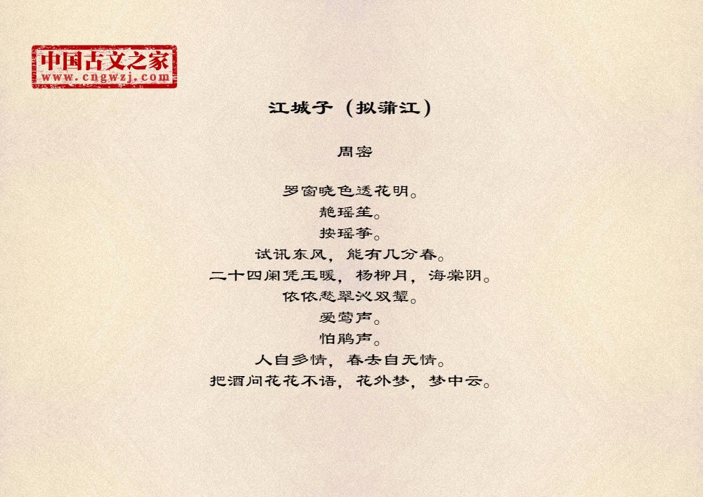 周密(1232-1298),字公谨,号草窗,又号四水潜夫、弁阳老人、华不注山人,南宋词人、文学家。祖籍济南,流寓吴兴(今浙江湖州)。宋德右间为义乌县(