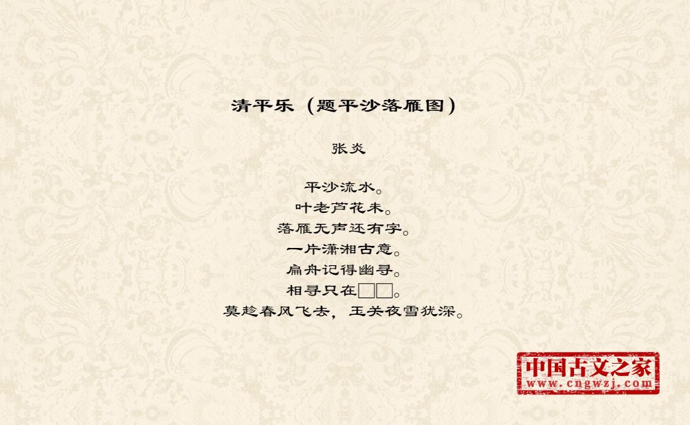 平沙流水。叶老芦花未。落雁无声还有字。一片潇湘古意。扁舟记得幽寻。相寻只在□□。莫趁春风飞去,玉关夜雪犹深。