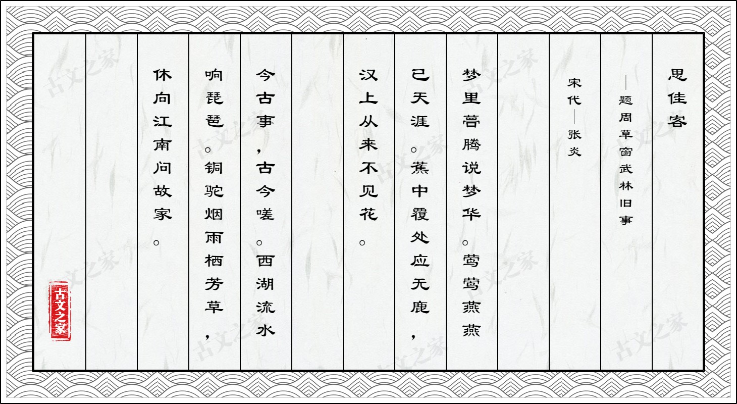 今古事,古今嗟。西湖流水响琵琶。铜驼烟雨栖芳草,休向江南问故家。