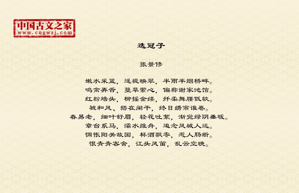 嫩水采蓝,遥堤映翠,半雨半烟桥畔。鸣禽弄舌,蔓草萦心,偏称谢家池馆。红粉墙头,柳摇金缕,纤柔舞腰低软。被和风、搭在阑干,终日绣帘谁卷。春易老,细叶舒眉,轻花吐絮,渐觉绿阴垂暖。章台系马,灞水维舟,追念凤城人远。惆怅阳关故国,杯酒飘零,惹人肠断。恨青青客舍,江头风笛,乱云空晚。