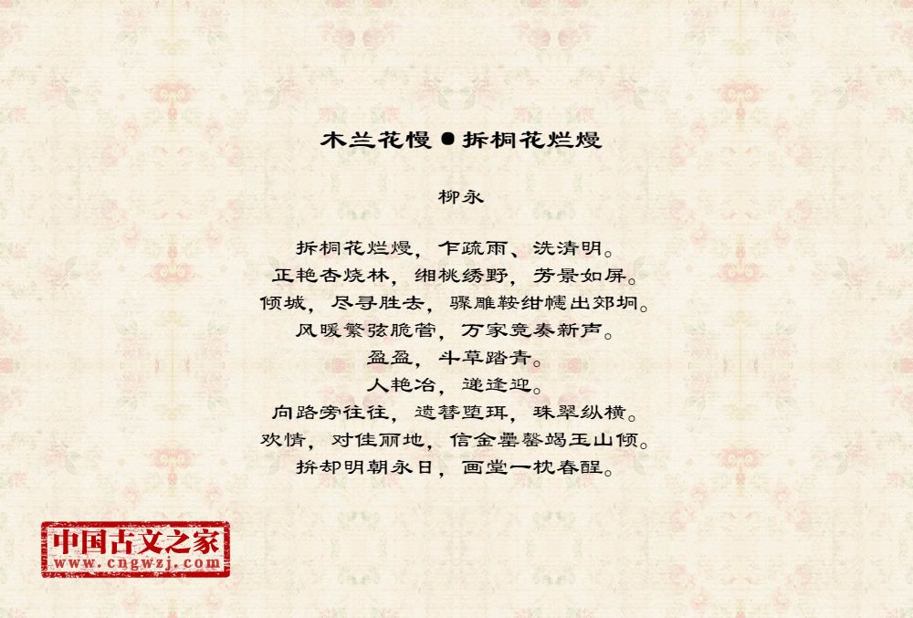 拆桐花烂熳,乍疏雨、洗清明。正艳杏烧林,缃桃绣野,芳景如屏。倾城,尽寻胜去,骤雕鞍绀幰出郊坰。风暖繁弦脆管,万家竞奏新声。盈盈,斗草踏青。人艳冶,递逢迎。向路旁往往,遗簪堕珥,珠翠纵横。欢情,对佳丽地,信金罍罄竭玉山倾。拚却明朝永日,画堂一枕春酲。