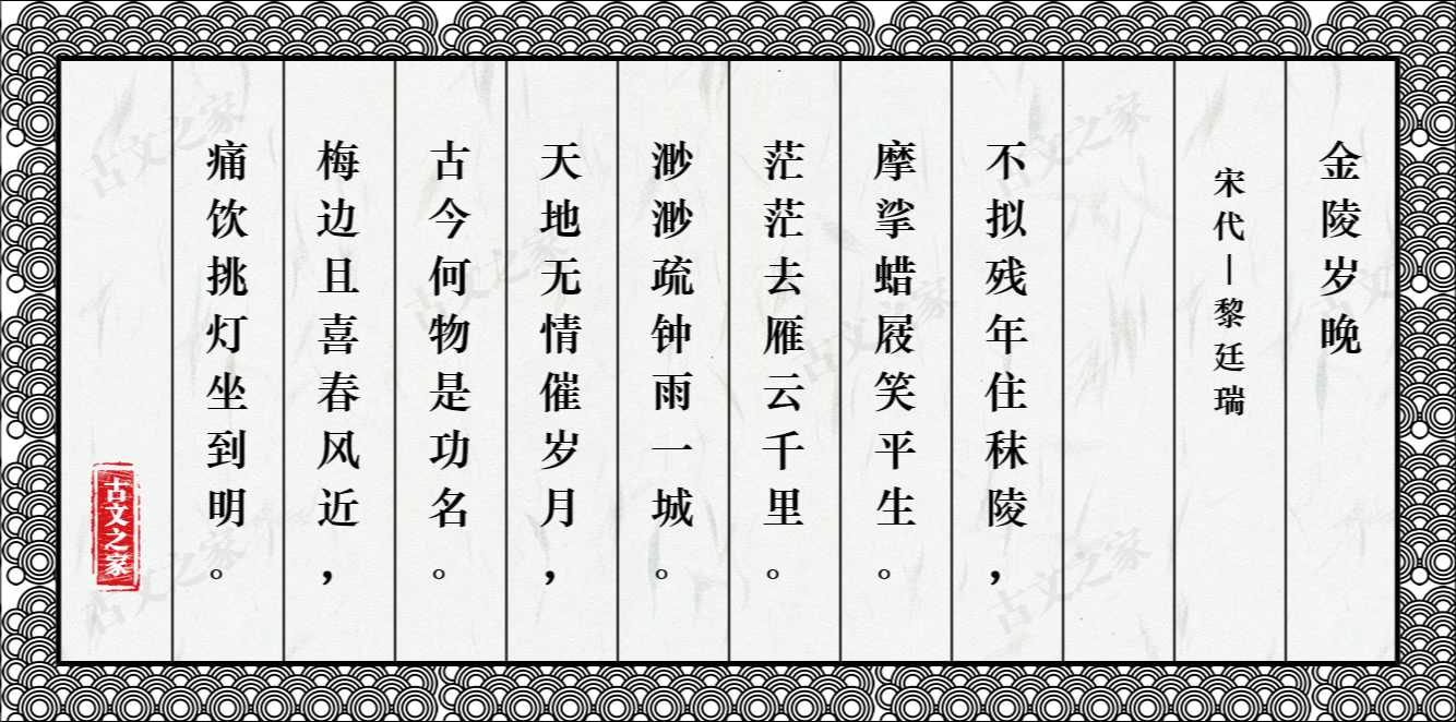 不拟残年住秣陵,摩挲蜡屐笑平生。 茫茫去雁云千里。渺渺疏钟雨一城。 天地无情催...