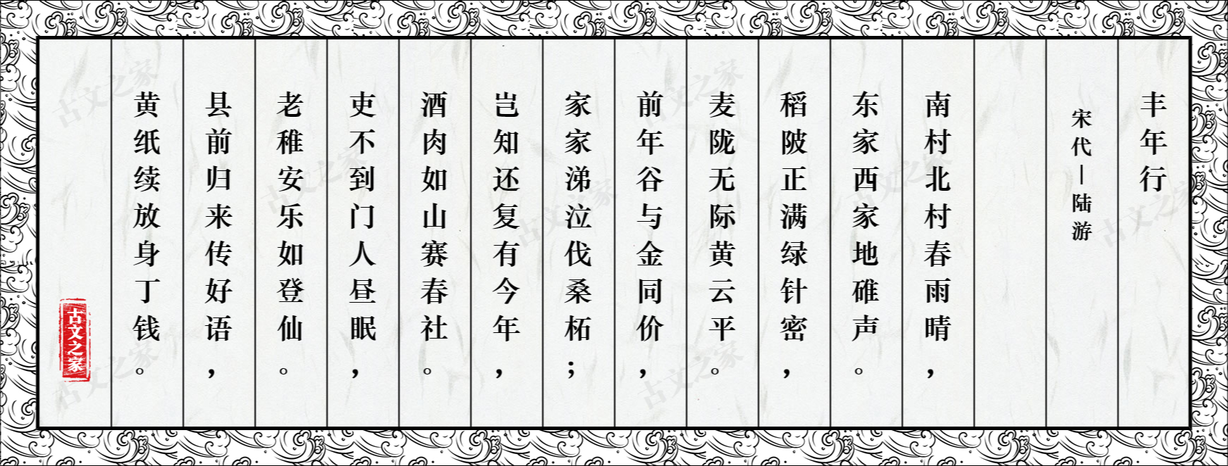 陆游(1125—1210),字务观,号放翁。汉族,越州山阴(今浙江绍兴)人,南宋著名诗人。少时受家庭爱国思想熏陶,高宗时应礼部试,为秦桧所黜。孝宗时赐