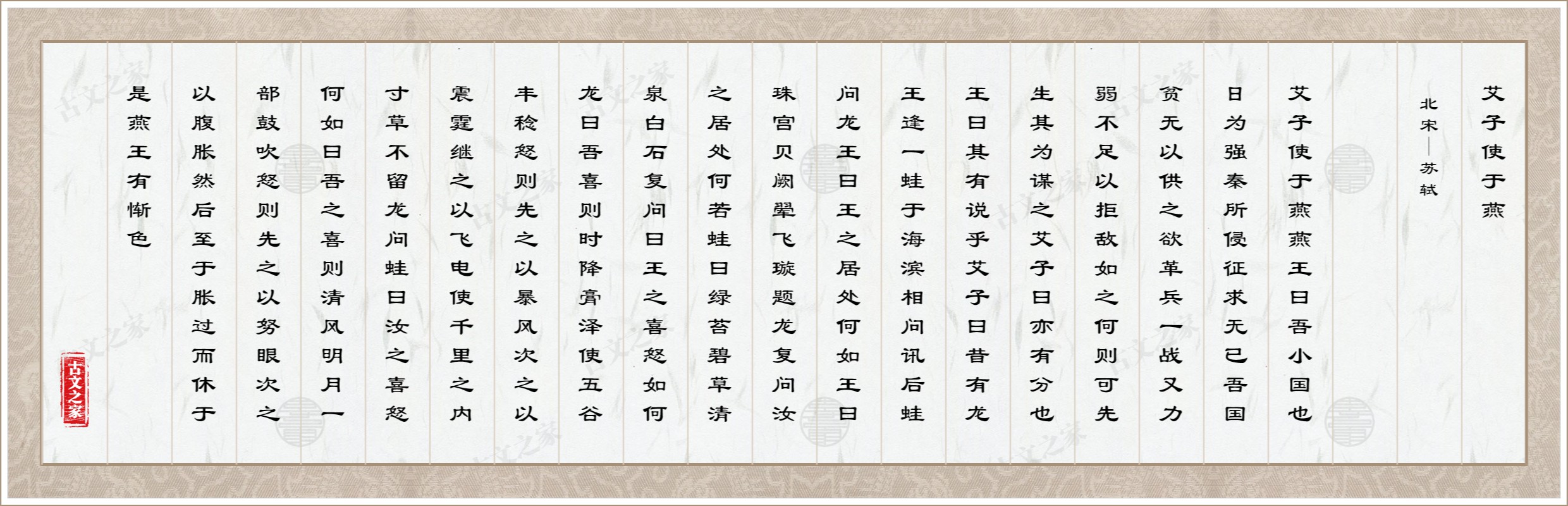 艾子使于燕,燕王曰:“吾小国也,日为强秦所侵,征求无已,吾国贫,无以供之,欲革兵一战,又力弱,不足以拒敌,如之何则可?先生其为谋之。”艾子曰:“亦有分也。”王曰:“其有说乎?”艾子曰:“昔有龙王,逢一蛙于海滨,相问讯后,蛙问龙王曰:‘王之居处何如?’王曰:‘珠宫贝阙,翚飞璇题。’龙复问:‘汝之居处何若?’蛙曰:‘绿苔碧草,清泉白石。’复问曰:‘王之喜怒如何?’龙曰:‘吾喜,则时降膏泽,使五谷丰稔;怒,则先之以暴风,次之以震霆,继之以飞电,使千里之内,寸草不留。’龙问蛙曰:‘汝之喜怒何如?’曰:‘吾之喜,则清风明月,一部鼓吹;怒,则先之以努眼,次之以腹胀,然后至于胀过而休。’”于是,燕王有惭色。