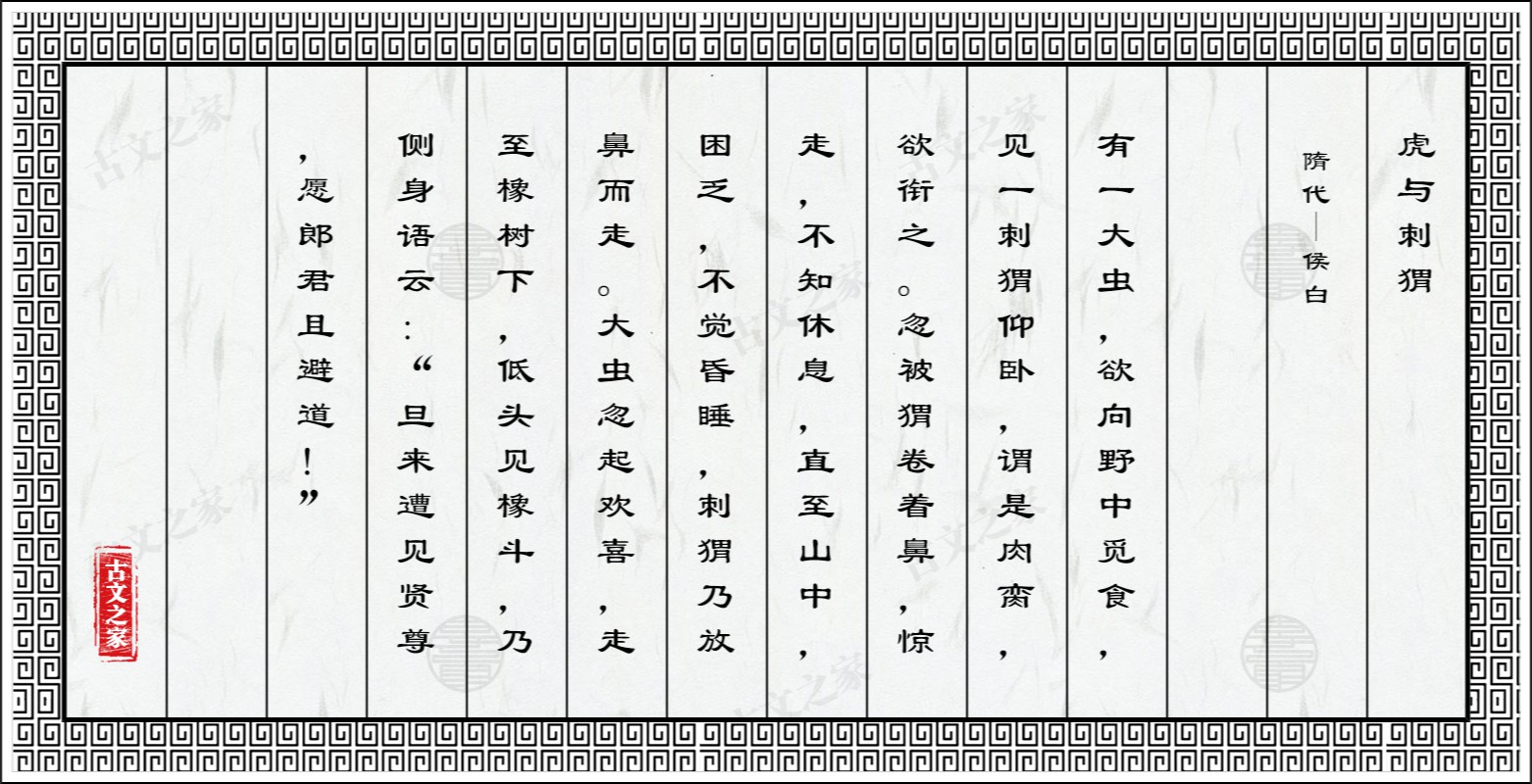 有一大虫,欲向野中觅食,见一刺猬仰卧,谓是肉脔,欲衔之。