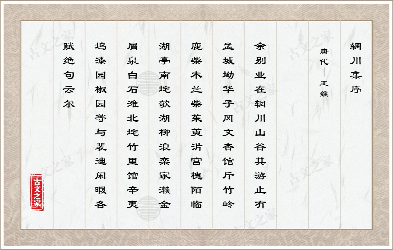 我在辋川山谷有一处别墅,那里的游览休憩之处包括孟城坳、华子冈、文杏馆、斤竹岭、鹿柴、木兰柴、茱萸沜、宫槐陌、临湖亭、南垞、欹湖、柳浪、栾家濑、金屑泉、白石滩、北垞、竹里馆、辛夷坞、漆园、椒园等,与裴迪闲暇时在这些地方分别赋写一些绝句而已。