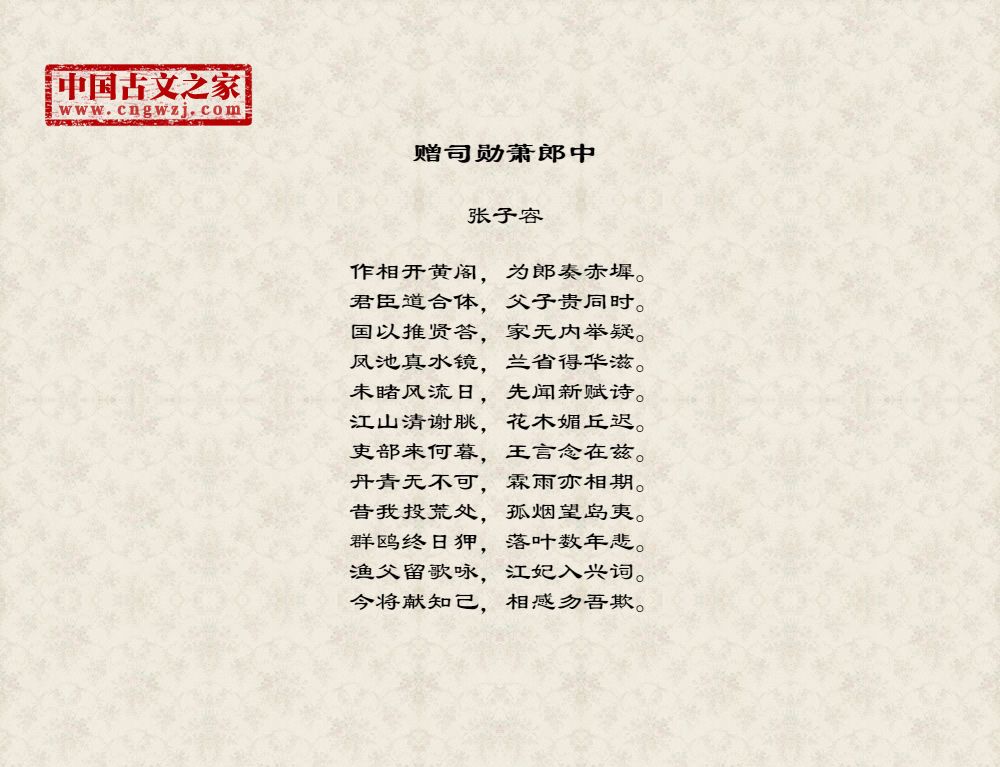作相开黄阁,为郎奏赤墀。君臣道合体,父子贵同时。国以推贤答,家无内举疑。凤池真水镜,兰省得华滋。未睹风流日,先闻新赋诗。江山清谢脁,花木媚丘迟。吏部来何暮,王言念在兹。丹青无不可,霖雨亦相期。昔我投荒处,孤烟望岛夷。群鸥终日狎,落叶数年悲。渔父留歌咏,江妃入兴词。今将献知己,相感勿吾欺。