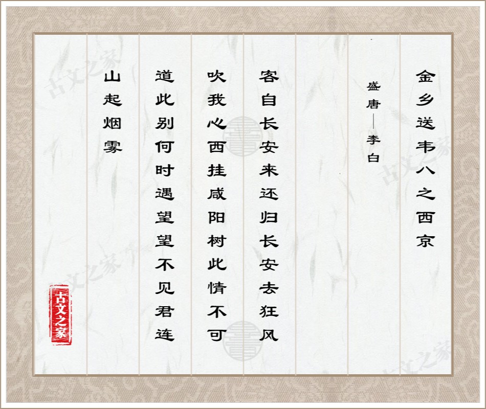 ⑴金乡:今山东省金乡县。《元和郡县志》卷十河南道兖州金乡县:“后汉于今兖州任城县西南七十五里置金乡县。”韦八:生平不详,李白的友人。西京:即长安,公元742年(天宝元年)改称西京。