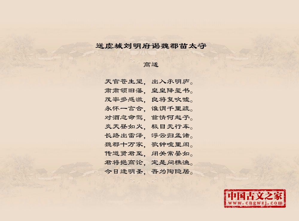 高适是我国唐代著名的边塞诗人,世称“高常侍”。作品收录于《高常侍集》。高适与岑参并称“高岑”,其诗作笔力雄健,气势奔放,洋溢着盛唐时期所特有的奋发进取