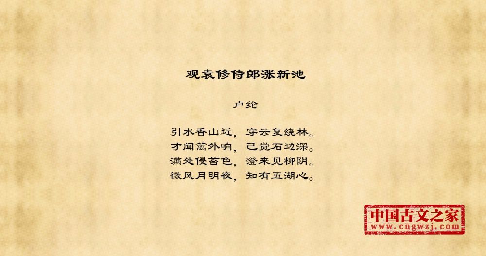 引水香山近,穿云复绕林。才闻篱外响,已觉石边深。满处侵苔色,澄来见柳阴。微风月明夜,知有五湖心。