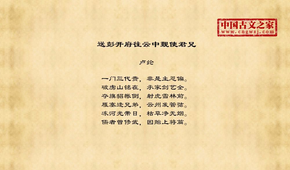 一门三代贵,非是主恩偏。破虏山铭在,承家剑艺全。夺旗貂帐侧,射虎雪林前。雁塞逢兄弟,云州发管弦。冻河光带日,枯草净无烟。儒者曾修武,因贻上将篇。