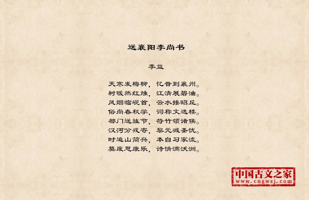 天寒发梅柳,忆昔到襄州。树暖然红烛,江清展碧油。风烟临岘首,云水接昭丘。俗尚春秋学,词称文选楼。都门送旌节,符竹领诸侯。汉沔分戎寄,黎元减圣忧。时追山简兴,本自习家流。莫废思康乐,诗情满沃洲。