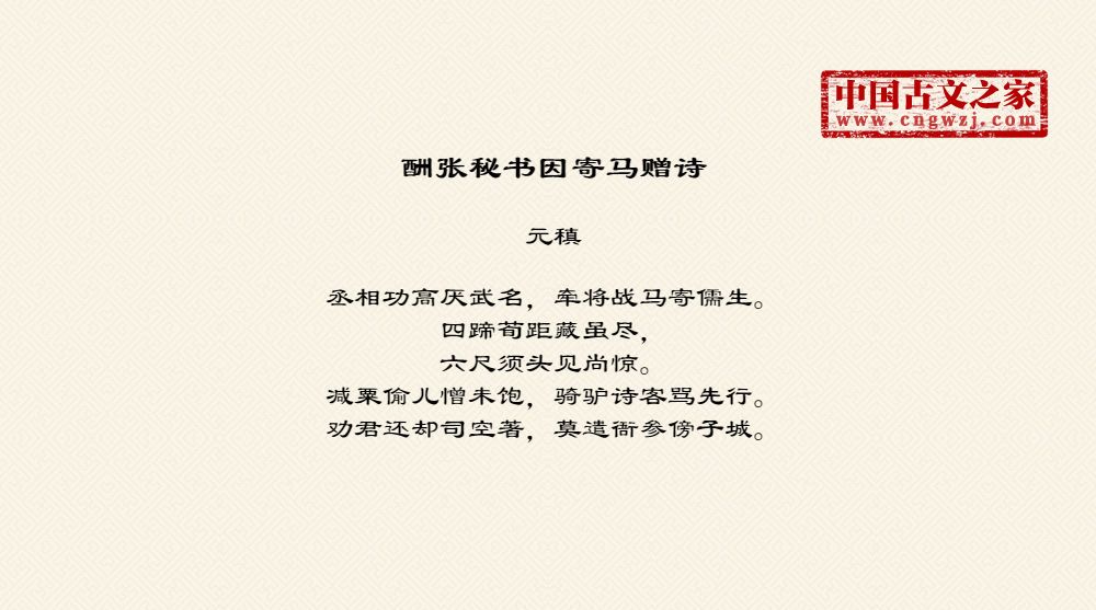 丞相功高厌武名,牵将战马寄儒生。四蹄荀距藏虽尽,六尺须头见尚惊。减粟偷儿憎未饱,骑驴诗客骂先行。劝君还却司空著,莫遣衙参傍子城。