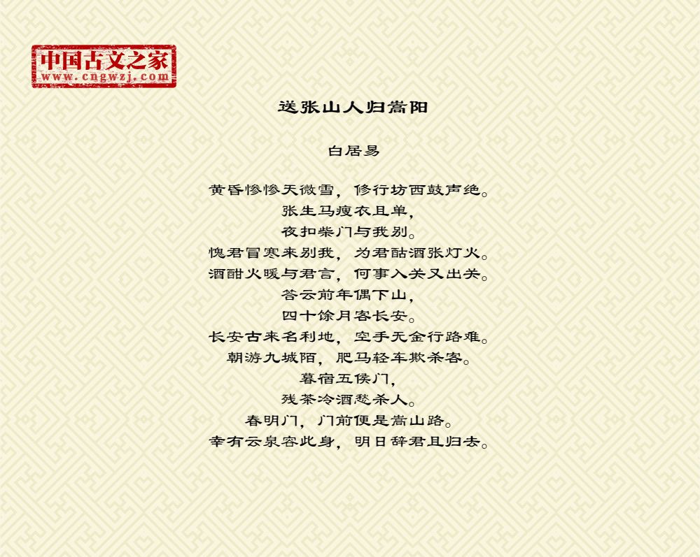 黄昏惨惨天微雪,修行坊西鼓声绝。张生马瘦衣且单,夜扣柴门与我别。愧君冒寒来别我,为君酤酒张灯火。酒酣火暖与君言,何事入关又出关。答云前年偶下山,四十馀月客长安。长安古来名利地,空手无金行路难。朝游九城陌,肥马轻车欺杀客。暮宿五侯门,残茶冷酒愁杀人。春明门,门前便是嵩山路。幸有云泉容此身,明日辞君且归去。