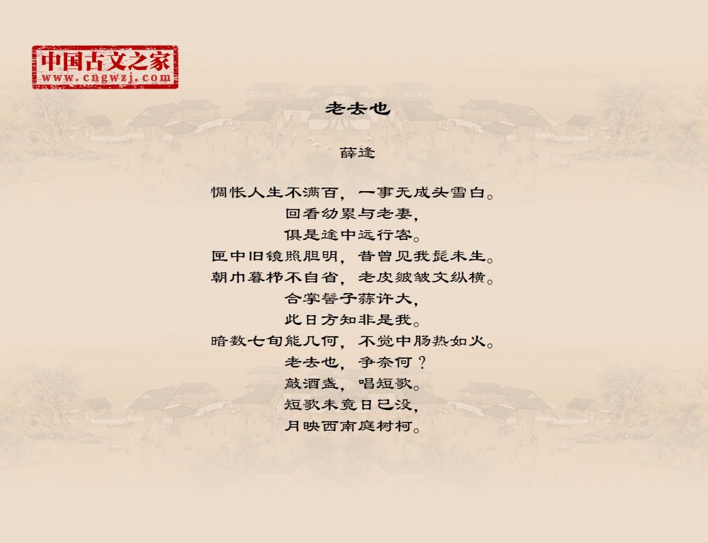 惆怅人生不满百,一事无成头雪白。回看幼累与老妻,俱是途中远行客。匣中旧镜照胆明,昔曾见我髭未生。朝巾暮栉不自省,老皮皴皱文纵横。合掌髻子蒜许大,此日方知非是我。暗数七旬能几何,不觉中肠热如火。老去也,争奈何?敲酒盏,唱短歌。短歌未竟日已没,月映西南庭树柯。