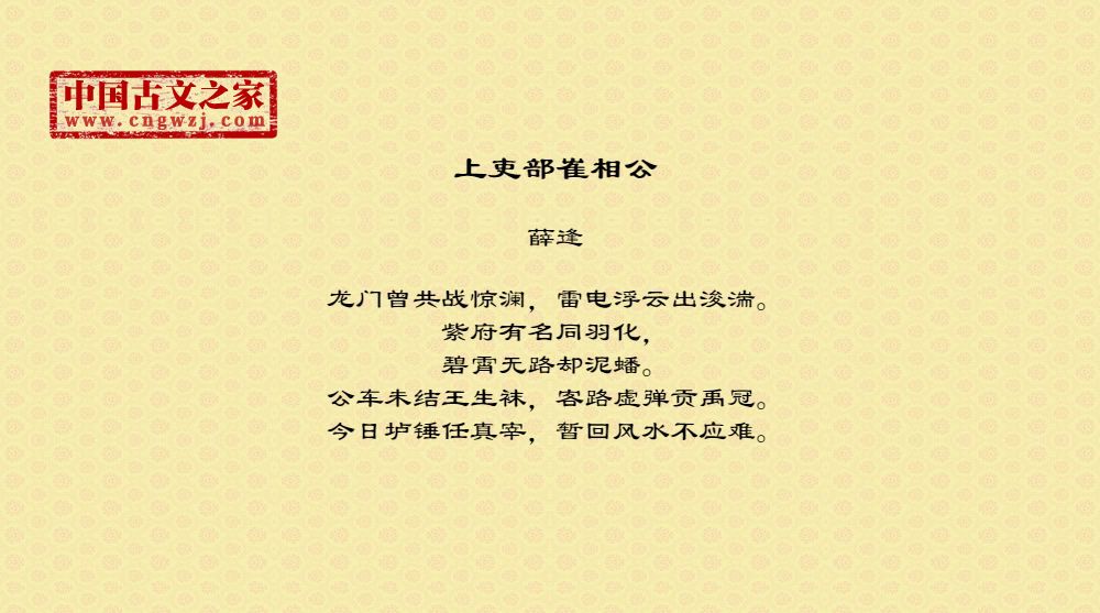 薛逢,字陶臣,蒲洲河东(今山西永济县)人,会昌元年(公元八四一)进士。历侍御史、尚书郎。因恃才傲物,议论激切,屡忤权贵,故仕途颇不得意。《全唐诗》收录