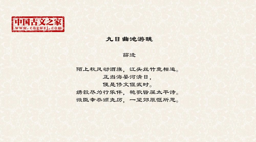 陌上秋风动酒旗,江头丝竹竞相追。正当海晏河清日,便是修文偃武时。绣毂尽为行乐伴,艳歌皆属太平诗。微臣幸忝颁尧历,一望郊原惬所思。