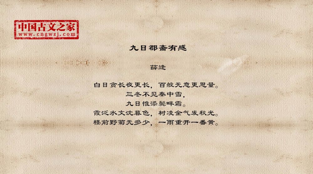 白日贪长夜更长,百般无意更思量。三冬不见秦中雪,九日惟添鬓畔霜。霞泛水文沈暮色,树凌金气发秋光。楼前野菊无多少,一雨重开一番黄。