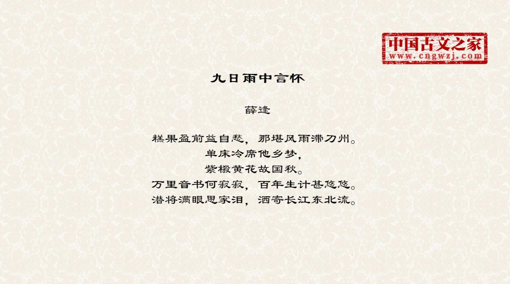 糕果盈前益自愁,那堪风雨滞刀州。单床冷席他乡梦,紫樧黄花故国秋。万里音书何寂寂,百年生计甚悠悠。潜将满眼思家泪,洒寄长江东北流。