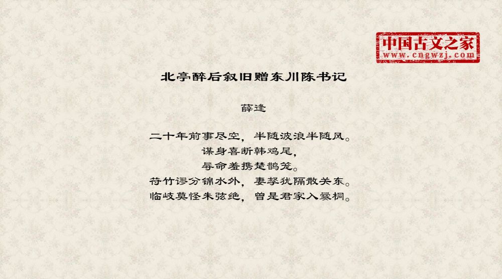薛逢,字陶臣,蒲洲河东(今山西永济县)人,会昌元年(公元八四一)进士。历侍御史、尚书郎。因恃才傲物,议论激切,屡忤权贵,故仕途颇不得意。《全唐诗》收录