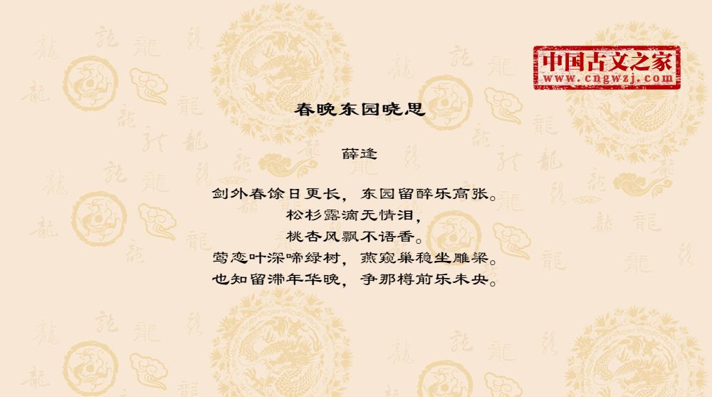 剑外春馀日更长,东园留醉乐高张。松杉露滴无情泪,桃杏风飘不语香。莺恋叶深啼绿树,燕窥巢稳坐雕梁。也知留滞年华晚,争那樽前乐未央。