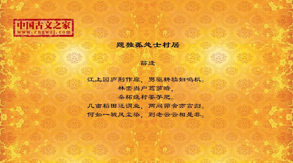 江上园庐荆作扉,男驱耕犊妇鸣机。林峦当户茑萝暗,桑柘绕村姜芋肥。几亩稻田还谓业,两间茆舍亦言归。何如一被风尘染,到老云云相是非。
