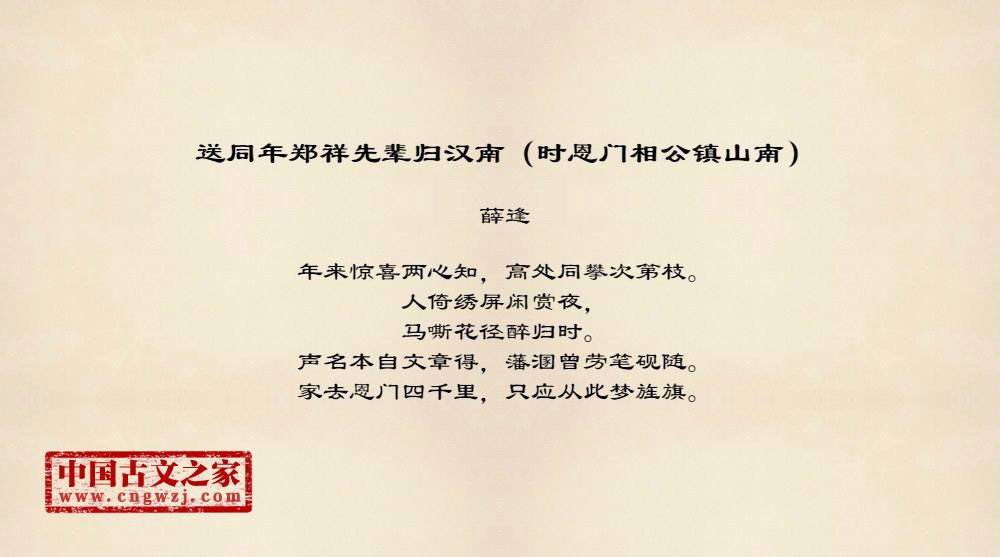 送同年郑祥先辈归汉南(时恩门相公镇山南)