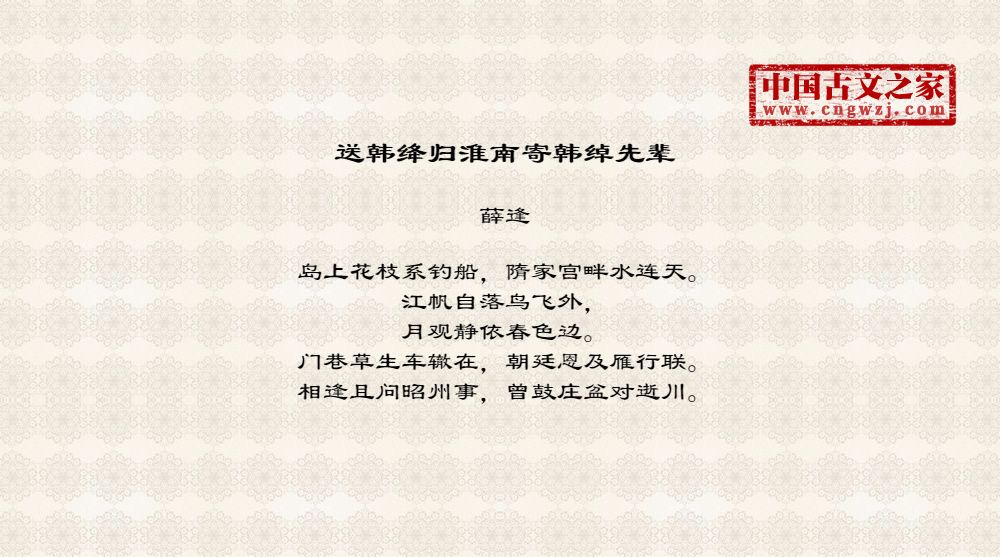 薛逢,字陶臣,蒲洲河东(今山西永济县)人,会昌元年(公元八四一)进士。历侍御史、尚书郎。因恃才傲物,议论激切,屡忤权贵,故仕途颇不得意。《全唐诗》收录