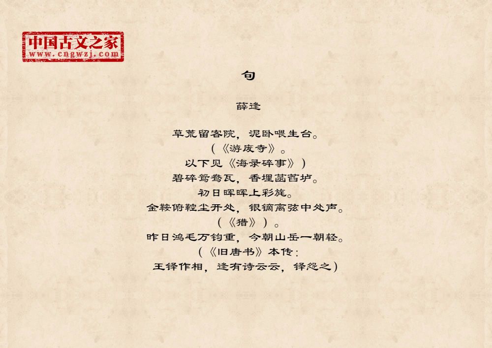 草荒留客院,泥卧喂生台。(《游废寺》。以下见《海录碎事》)碧碎鸳鸯瓦,香埋菡萏垆。初日晖晖上彩旄。金鞍俯鞚尘开处,银镝离弦中处声。(《猎》)。昨日鸿毛万钧重,今朝山岳一朝轻。(《旧唐书》本传:王铎作相,逢有诗云云,铎怨之)