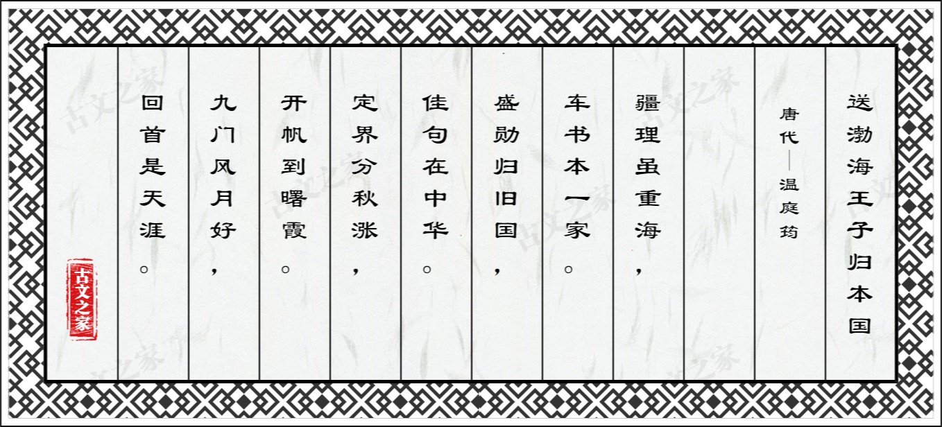 疆理虽重海,车书本一家。盛勋归旧国,佳句在中华。定界分秋涨,开帆到曙霞。九门风月好,回首是天涯。