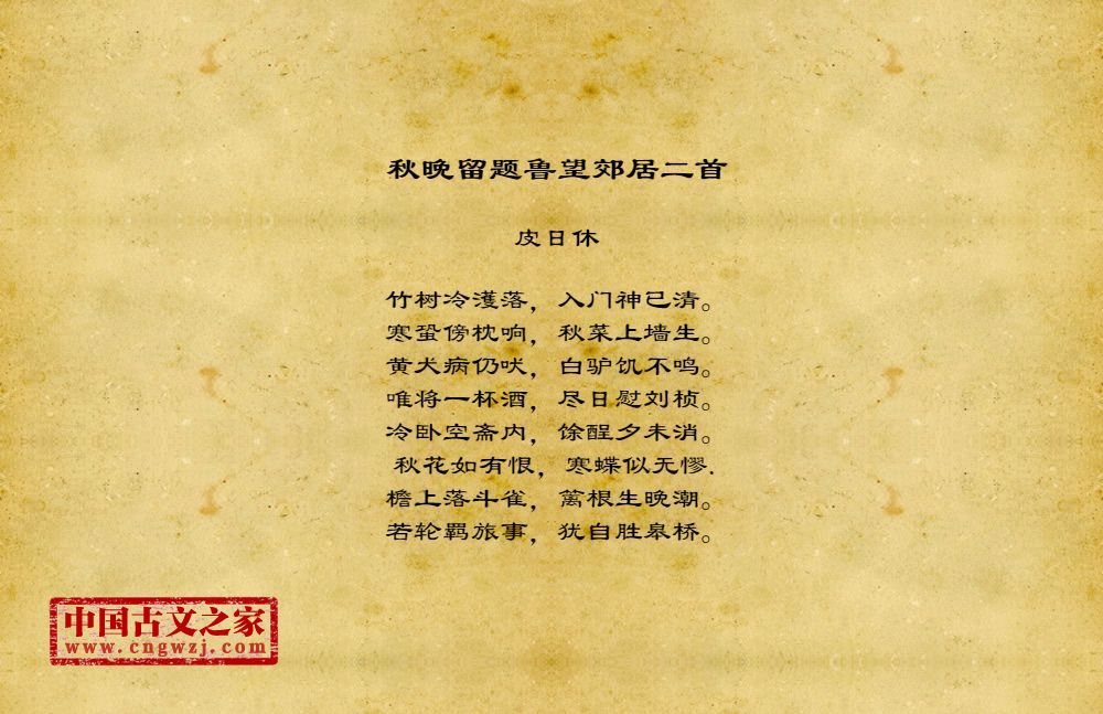 皮日休,字袭美,一字逸少,生于公元834至839年间,卒于公元902年以后。曾居住在鹿门山,自号鹿门子,又号间气布衣、醉吟先生。晚唐文学家、散文家,与