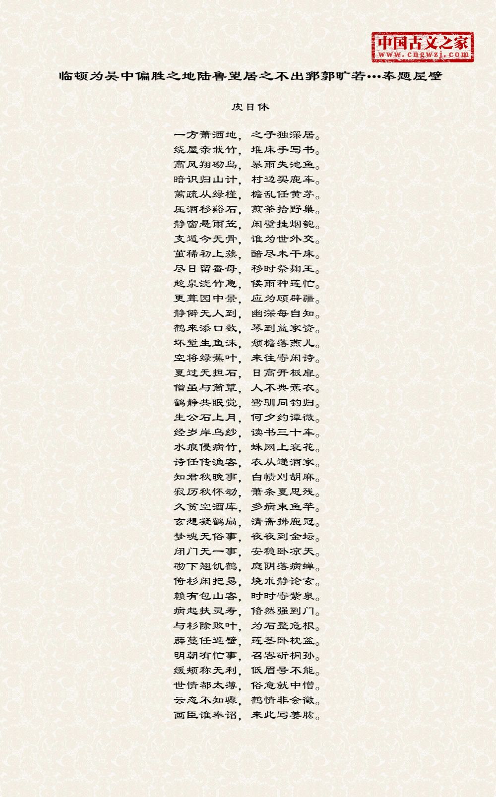 皮日休,字袭美,一字逸少,生于公元834至839年间,卒于公元902年以后。曾居住在鹿门山,自号鹿门子,又号间气布衣、醉吟先生。晚唐文学家、散文家,与