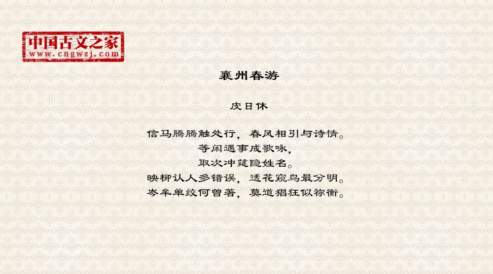 皮日休,字袭美,一字逸少,生于公元834至839年间,卒于公元902年以后。曾居住在鹿门山,自号鹿门子,又号间气布衣、醉吟先生。晚唐文学家、散文家,与