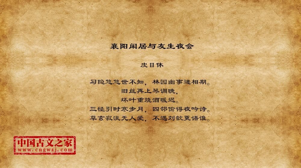 皮日休,字袭美,一字逸少,生于公元834至839年间,卒于公元902年以后。曾居住在鹿门山,自号鹿门子,又号间气布衣、醉吟先生。晚唐文学家、散文家,与